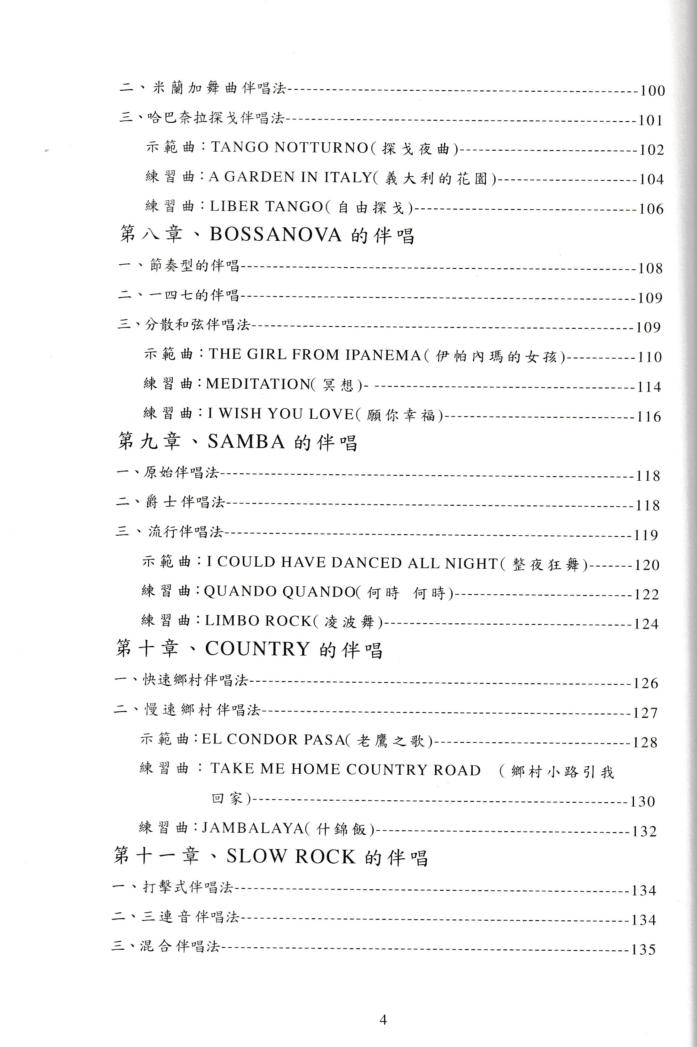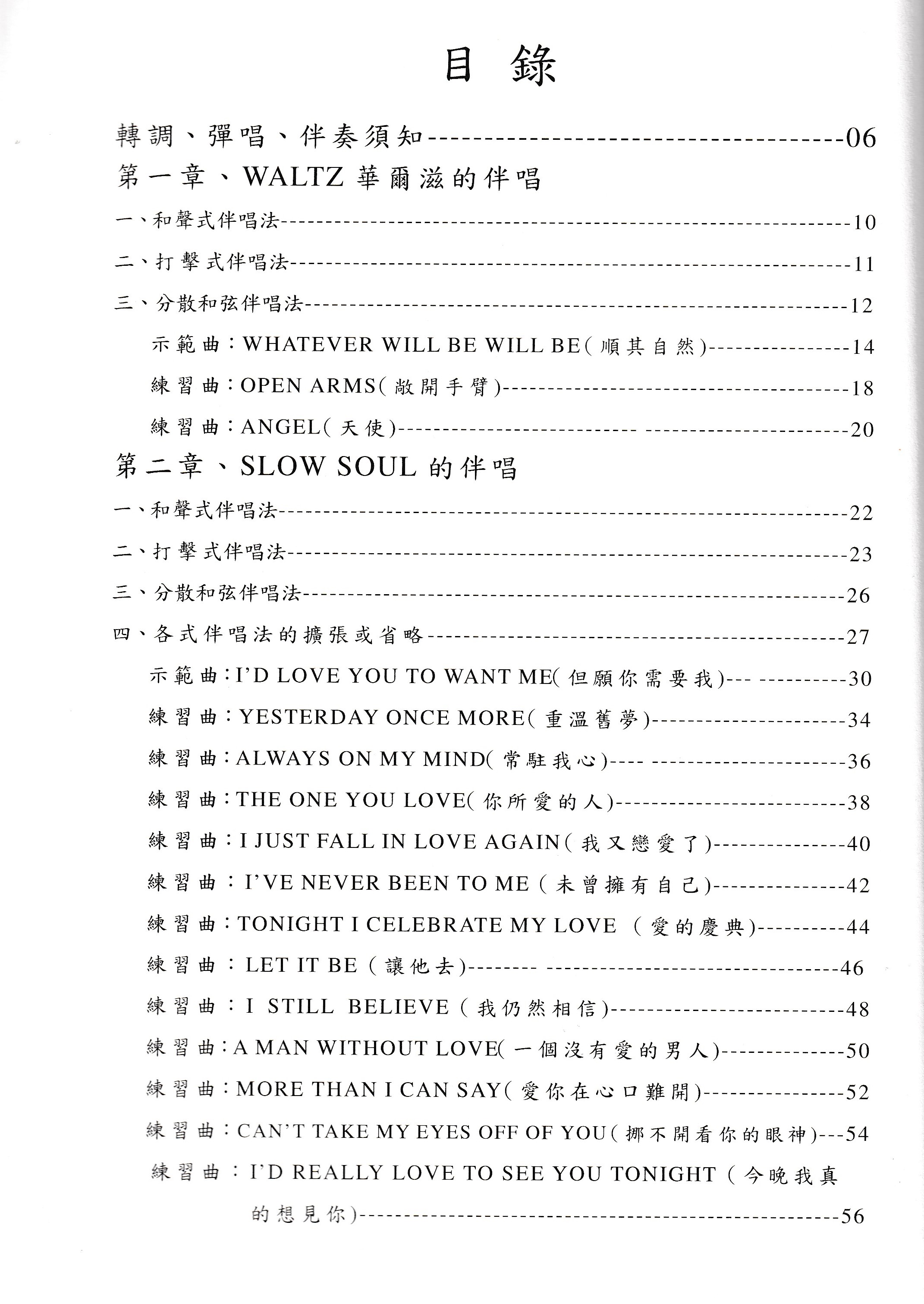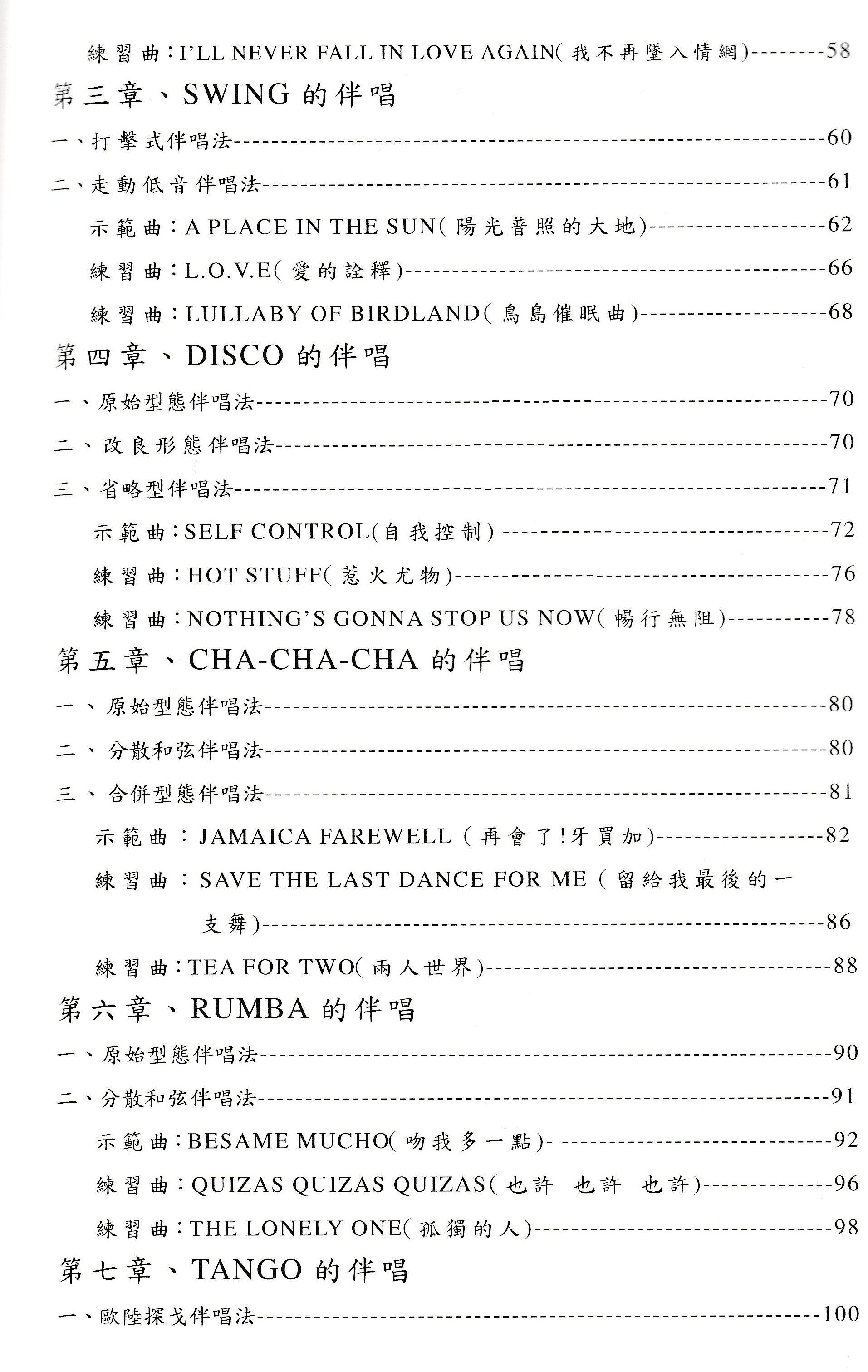本書共分為兩部分,第一篇為各種節奏的「自彈自唱練習」,第二篇為「轉調練習」,由於本書篇幅有限,因此在轉調練習部份只能羅列較為流行的少數歌曲讓學們從中領悟其竅門。學們應多利用閒暇時間,搜集最新之流行歌曲嘗試自己彈唱,如此才能得心應手,窺盡堂奧。