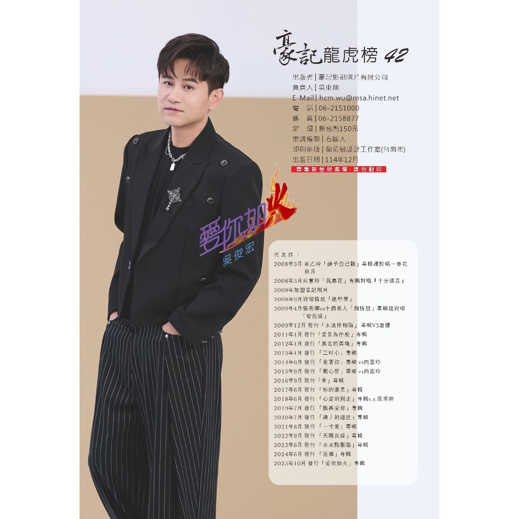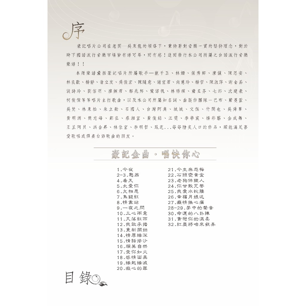 本冊樂譜囊括豪記唱片所屬歌手-龍千玉、林姍、張秀卿、黃思婷、唐儷、朱海君、陳思安、林良歡、楊靜、翁立友、吳俊宏、陳隨意、謝宜君、向蕙玲、楊哲、陳淑萍、謝金晶、莊振凱、談詩玲、董育君、劉信明、廖婉君、鄔兆邦…等等唱片主打歌曲,以及本公司所屬知名詞、曲製作團隊-張燕清、巴布、蕭蔓萱、吳梵、林東松、朱立勛、石國人、台灣阿典、城城、文傑、廖偉志、竹間也、吳舜華、黃明洲、簡志峰、鄭弘、蔡湘宜、黃俊銘、江雯、李學宸、楊彩藝、金城舞、王呈阿貝…等等膾炙人口的作品,願能滿足喜愛歌唱或彈奏台語歌曲的朋友。