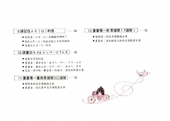 本書繪入許多可愛的插圖以增進學習符的興趣,並且由音符的唱法循序漸近的導入畫音符,讀者只要依照本書的順序,即可有流暢的成就感;祝福您的孩子對於認識五線譜更有興趣,能夠更快樂的學習音樂。