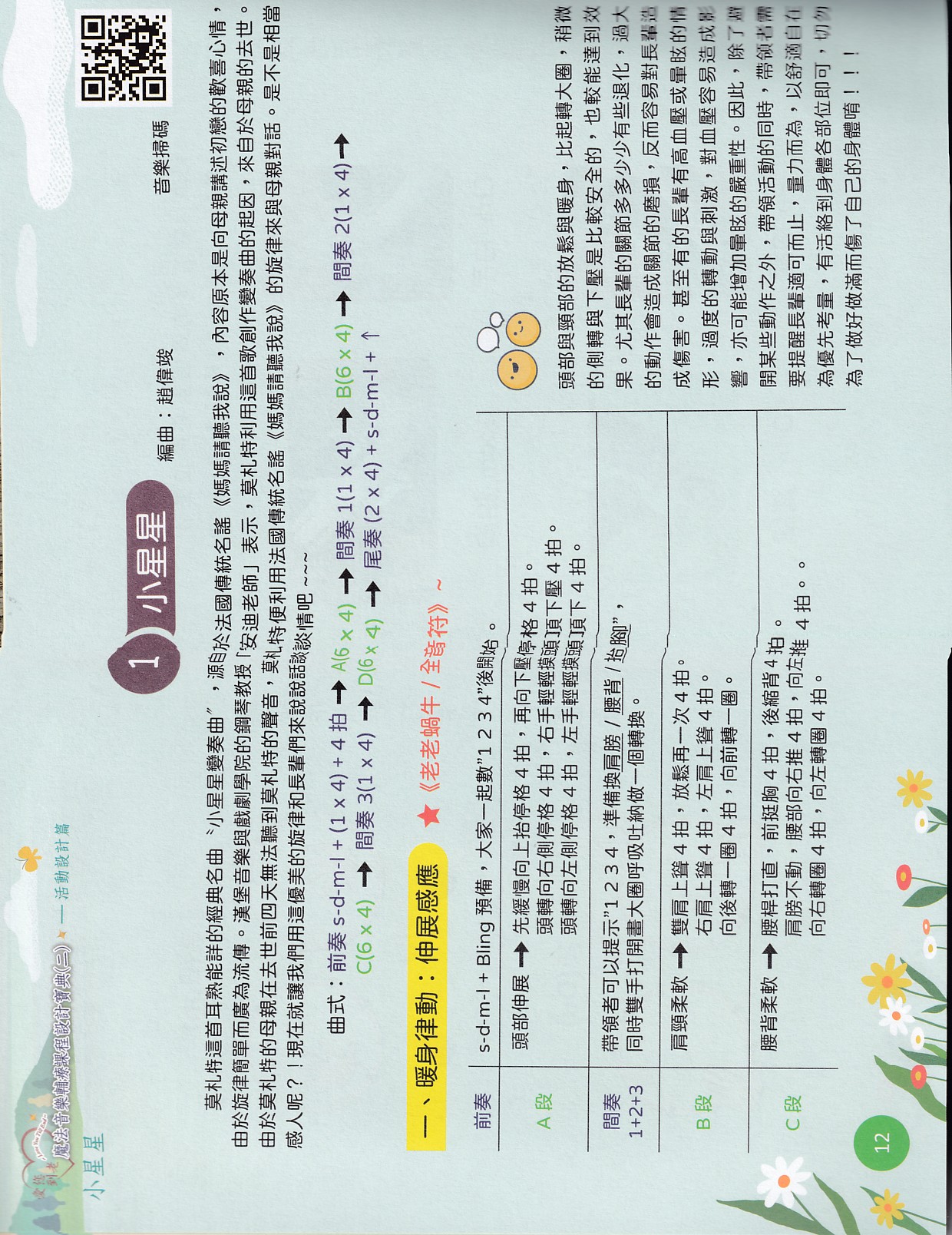 內容分[認知篇][技巧練功篇][應用篇],這是累積了15年在老人院教學,帶領長者們延緩老化、預防失智的最佳音樂輔療寶典,。豐富多元全面的課程設計內容,是音樂輔療師、指導員、志工必備的指導寶典用書!1書+音樂,理論與實踐並重!可另選購線上示範影片教程及培訓研習課程。