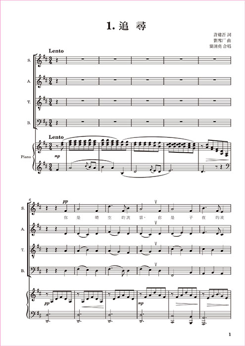 收錄音樂教師簡清堯合唱作品,有中文藝術歌曲與外文藝術歌曲兩個部分,SATB共23首歌。