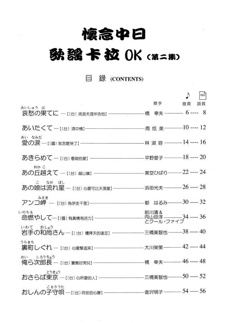 延續了懷念中日歌謠卡拉OK(第一集)編排方式,精選懷念昭和演歌暢銷曲,翻唱了(台)(國)語經典老歌,歌詞編譯日、中上下對照採用大字體、漢字注音及歌詞中文翻譯。演唱時可第一遍日語或第二遍套入(台)(國)語歌詞唱法歡唱教學。